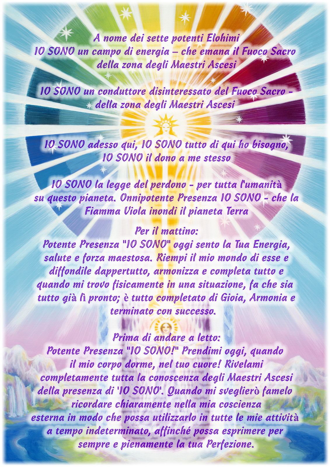 In ogni linguaggio la Parola IO SONO è la più potente parola che l’umanità in 4,5 milioni di anni l’avesse mai usata. Questa parola è la Forza della luce! Quando la pronunciate è un appello a tutto il potere della Luce che inizia ad ‘agire nel vostro punto nell’universo. Essi confermano il fatto che voi siete la creatura Divina e che il Potere della Luce è in voi la forza di Dio – del Sacro IO SONO.